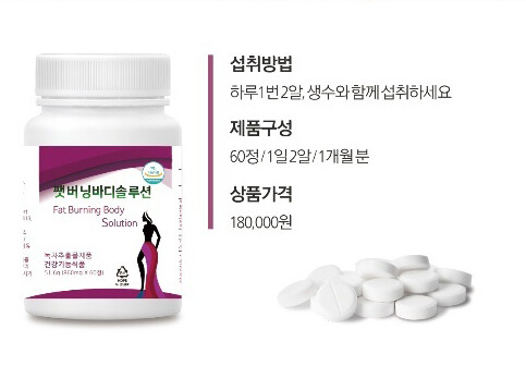 팻버닝바디솔루션 다이어트 녹차추출물 카테킨, 밀크시슬, 클레우스포스콜리, 엘카르티닌, 마테, 효모 성분이 들어가 있는 다이어트보조제