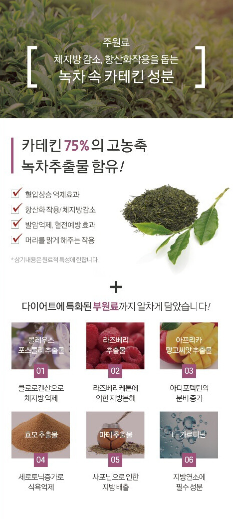 우리나라 식약처에서 다이어트보조제 성분으로 등록되어 있는 카테틴 성분이 주원료입니다.